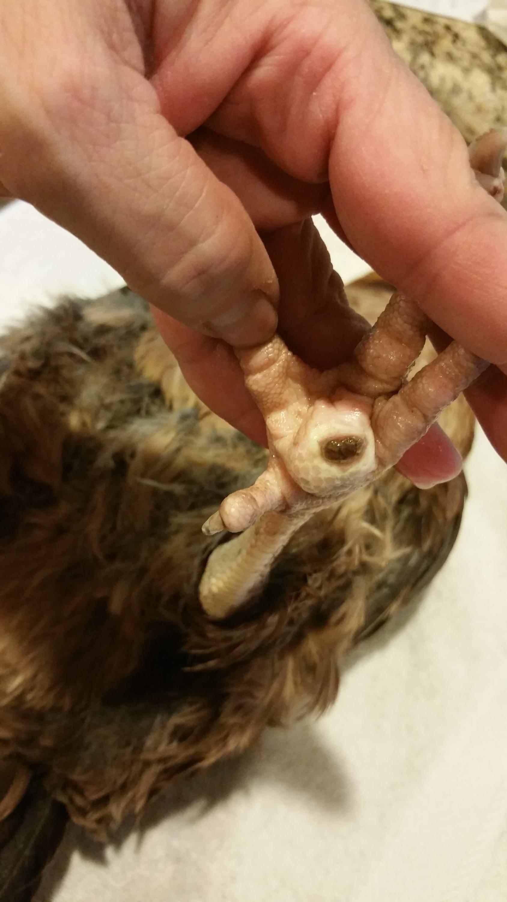 Most people don’t realize that there’s a problem until the chicken has a dark brown/black kind of scab on the bottom of their foot